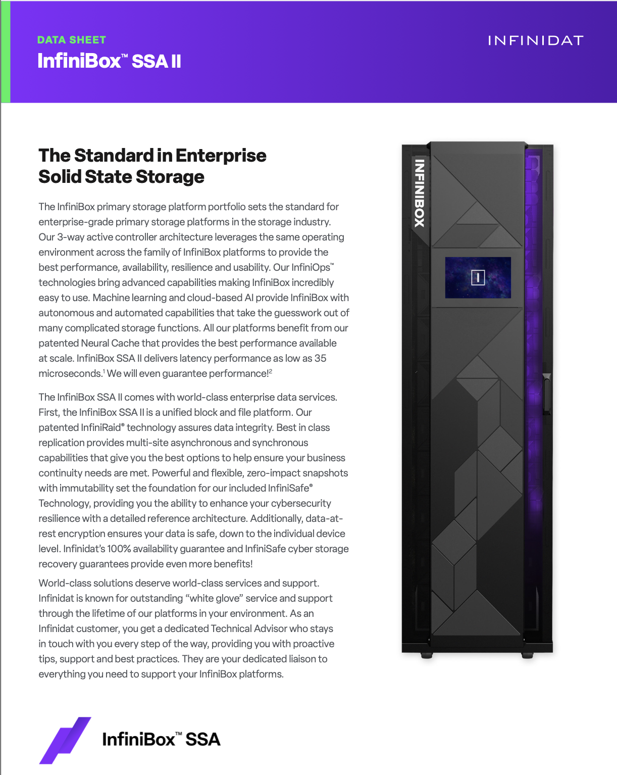InfiniBox SSA is Infinidat’s 100% solid-state storage platform especially designed for the most performance-sensitive, mission-critical workloads.