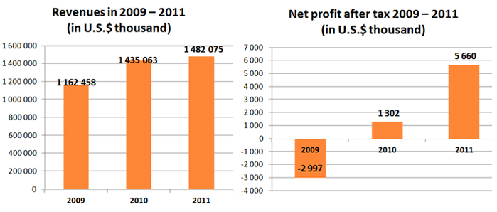 For the twelve months of 2011 ASBISc revenues grew by 3.28% to USD 1.482 billion, from USD 1.435 billion in 2010. Net profit after tax grew to USD 5.660 million, from USD 1.302 million, thereby significantly exceeding the Company’s financial forecasts.